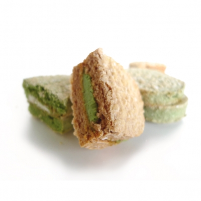 ■原材料 粉ニッキ使用(抹茶クリーム)/卵白、砂糖、アーモンド、食用加工油脂、粉糖、大麦粉、米粉(国内産)、桂皮末、粉末水飴、抹茶、クロレラ、バター、コンニャクイモ抽出物